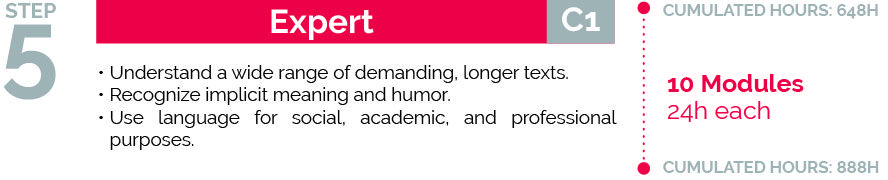 The Expert C1/C2 level program can be achieved within 10 or 16 terms depending on the pace you choose.